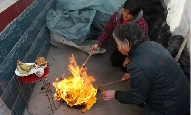 王爱英的再育之路并不顺利,2015年10月,她成功怀孕,结果发现是宫外孕。图为“十二日”这天,王爱英的婆婆烧纸祈福。