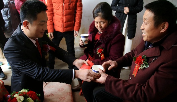 敬改口茶。新郎将新娘接走前,跪在地上敬改口茶。岳父岳母喝完改口茶,需要给新郎发红包。