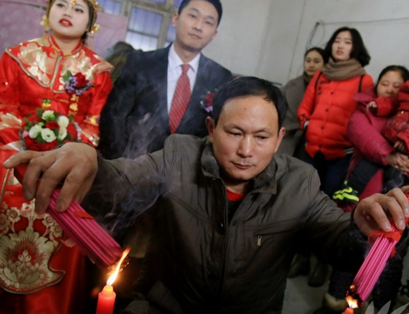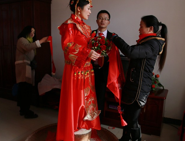 磕头礼。一对新人在农村举办婚礼。按照当地习俗,新人需要跪在门口向长辈行磕头礼。