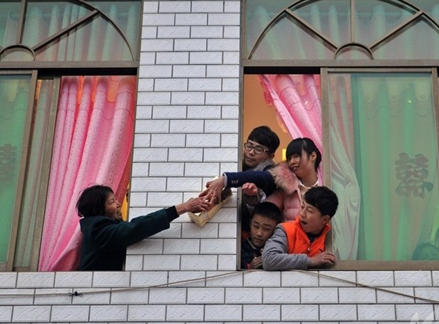 讨喜烟。在新房内关门的亲戚好友正在窗外与“说客”讨价还价,讨要喜烟。