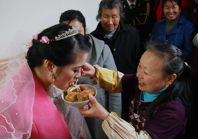 吃圆子。新娘出嫁前必须吃圆子和鸡肉。