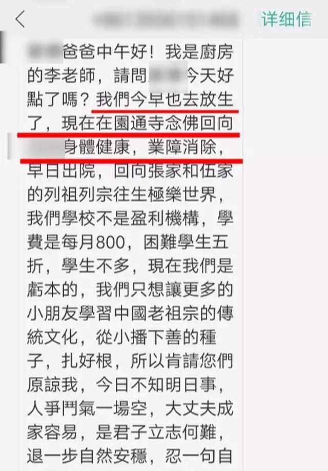 一名老师在短信中表示,他们一众老师都去了某寺庙,为程程的身体健康进行放生和祈祷。
