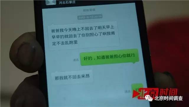 刘丽便用同学手机给父亲发去一条请假短信:“爸爸,我今天晚上不回去了,明天早上早早的就回去了,你别担心啊,我肯定不去乱跑。”
