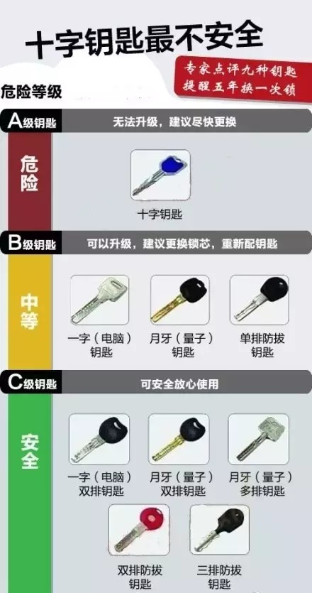 如果你家里使用的是"一字型"或"十字型"锁,这种锁属A级锁,极易被盗!而多排圆形凹槽的B级锁、C级锁相对安全。