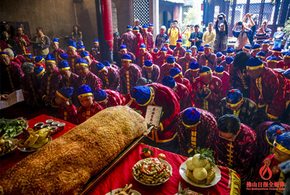 2016年12月21日,冬至,南海大沥平地黄氏大宗祠,平地村黄氏后人齐聚一堂,身着古装,手持燃香,在司仪的号令下向祖宗三叩首,举行隆重拜祭老祖宗德政公仪式。祠堂内祭祖,缅怀先祖,祈求来年顺利。组图/佛山日报记者王伟楠摄 (来自:佛山日报)