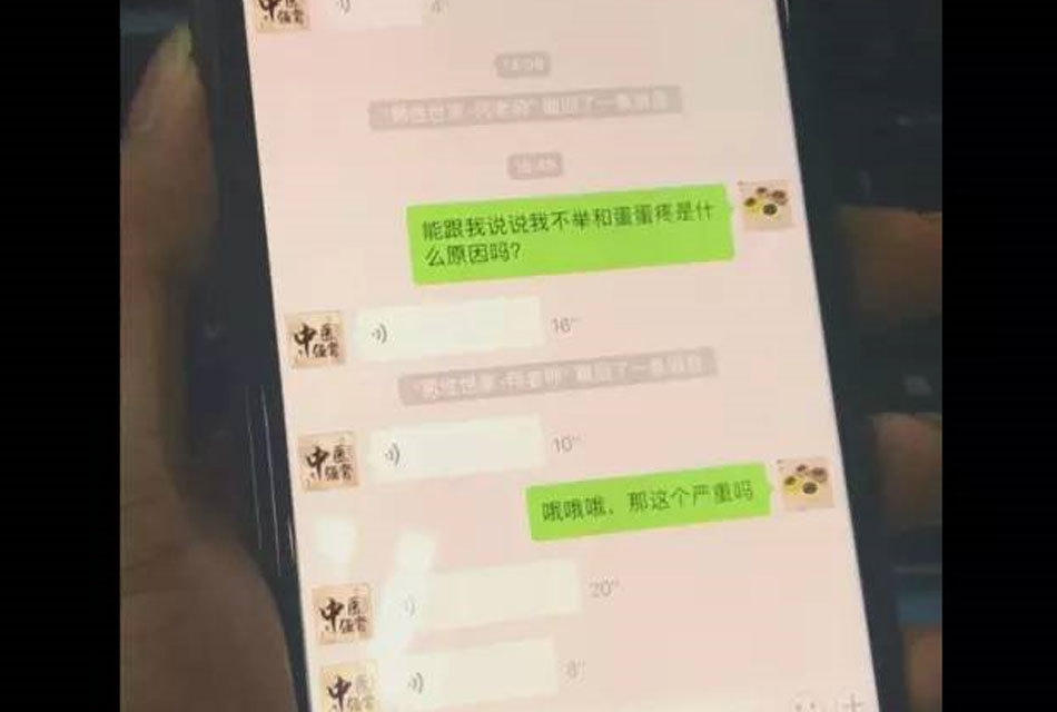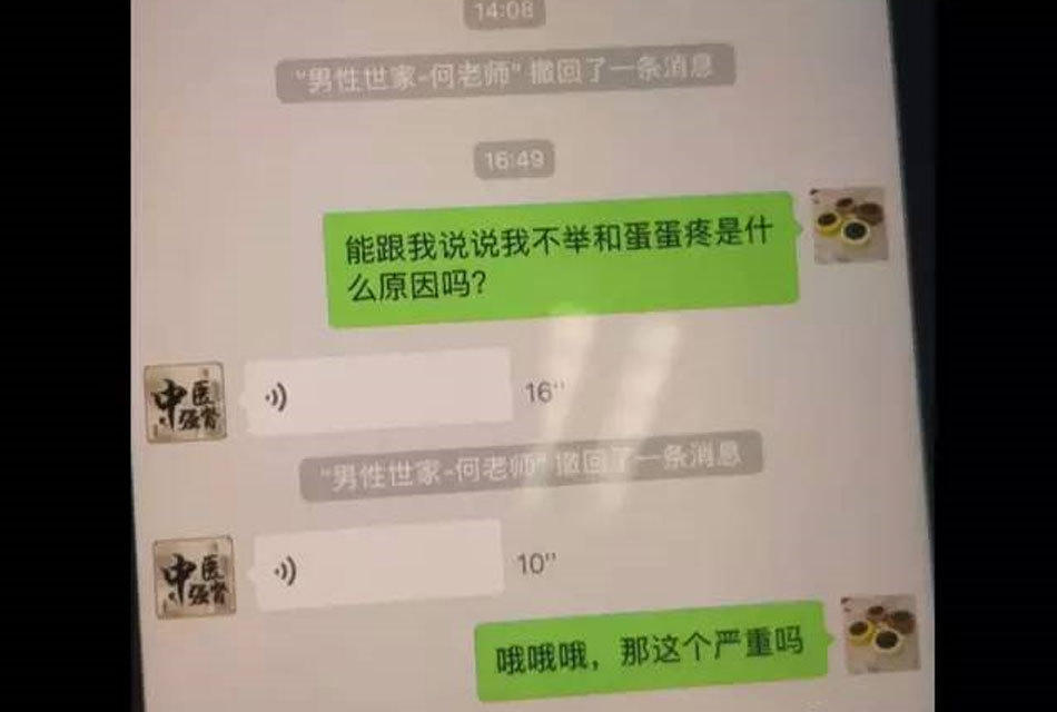 男性世家 “何老师”:你有毒素垃圾,这些毒素垃圾流进你的蛋蛋里,所以你就睾丸疼,药是一对一帮你去调配的,明白没有?如果说都能调配的话就不叫祖传秘方了。传统中医讲求“望闻问切”,这些微信老中医,患者本人都没见过就够胆下药?记者提出见面,但“老中医”不同意见面,只是发来一张疑似是增城区卫生局发出的医疗机构执业许可证,来证明自己是真材实料。 (来自:广东台今日关注)