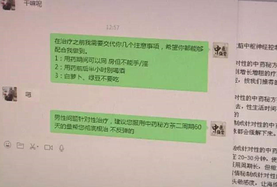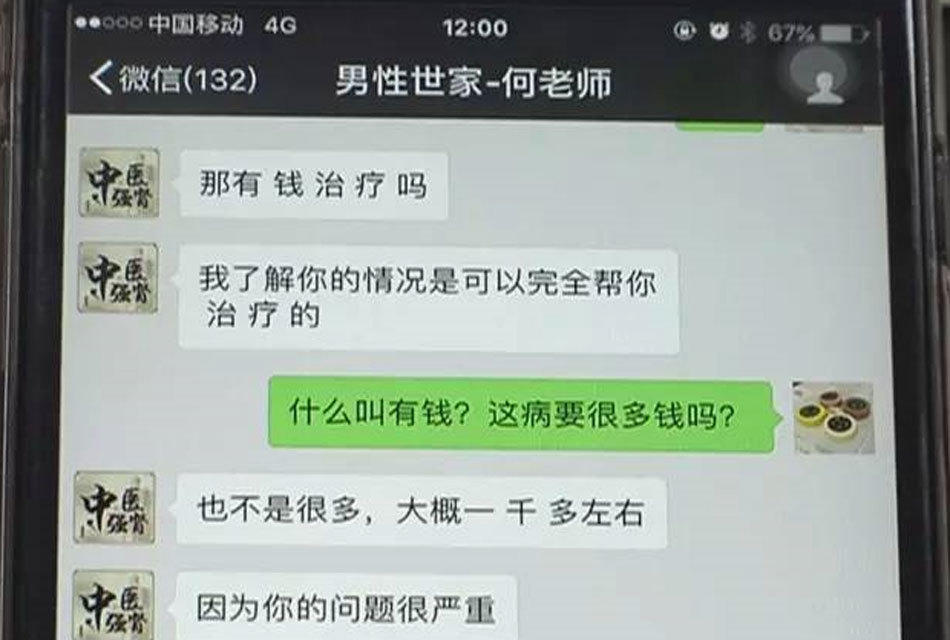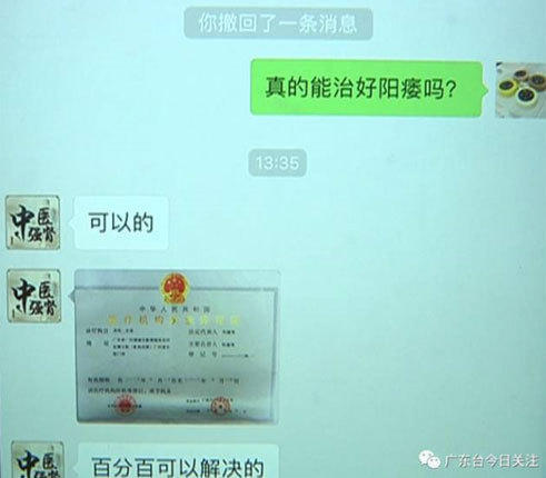 市民 李先生:有这个需要的人,去改善男性问题或者女性问题的,就来加这些所谓的老中医咨询。“你就是假扮老中医身份的人?”“对,没错。然后我们就会推配方,之后就按照我们的付款方式给钱发货。”李先生还透露,他们公司在一些粉丝众多的自媒体微信号投广告,吸引网友主动来添加所谓老中医微信号。每当有患者上钩,他们都会按照早前编好的剧本,先是恐吓患者,接着又诱导他们购买高价中药。 (来自:广东台今日关注)