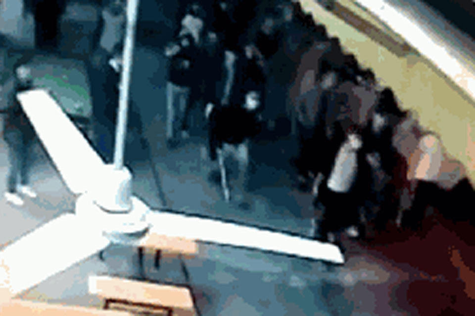 从监控视频显示:数十个头着面罩手持钢管的年轻人浩浩荡荡穿过商业街,突然就往前方冲去,但很快又转入一家士多店旁边的楼道。附近有商家看到这一幕,都吓得不敢出来。 (来自:广东广播电视台)