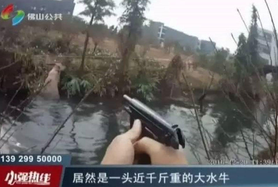 12月20日上午11点左右,在勒流连杜村沙地附近一片菜地内,传来多声枪响,而民警开枪射击的对象,居然是一头近千斤重的大水牛。警方为什么要对一只水牛下此重手呢?事情就要从当日早上10点半说起,28头来自云南的大水牛刚刚运到勒流信良屠宰有限公司,正在卸车运进仓库等待屠宰,想不到其中一头大水牛突然挣脱逃跑。 (来自:佛山电视台)