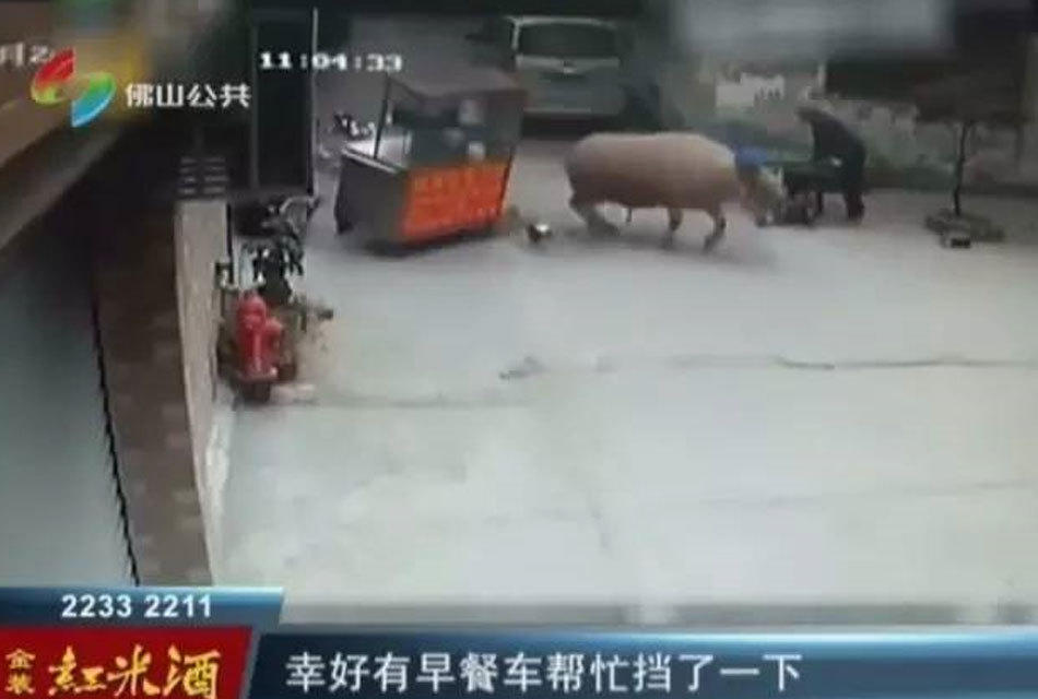 之后,挣脱控制的大水牛居然沿着马路一路狂奔,到处乱闯,先是跑进了附近一处工厂,把工厂的玻璃门都撞破了,在工厂内撒了个野,然后又跑到连杜村,将村中一名卖熟食的婆婆整个撞飞。幸好有早餐车帮忙挡了一下,阿婆只是受了轻伤。勒流派出所接到报警之后,迅速组织警力,沿着水牛逃跑的路线追踪,但是奇怪的是,民警追到一片菜地后,水牛却离奇失去了踪影。 (来自:佛山电视台)