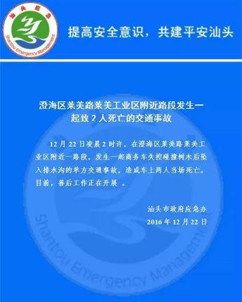 12月22日凌晨2时许,在澄海区莱美路莱美工业区附近一路段,发生一起商务车失控碰撞树木后坠入排水沟的单方交通事故,造成车上两人当场死亡。目前,善后工作正在开展 。 (来自:汕头市政府应急办)