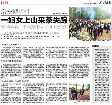 时间回到2013年4月19日上午9时,时年57岁的章女士和同村其他几个村民一起去采摘野生茶叶。这种野生茶叶很金贵,村民采来之后可以送人也可以出售,附近几个村庄也时常可见上山采茶者。当天他们一行人要去的是村子西南面的“皇天塘”山,这里野生茶叶多,但山路难走,悬崖峭壁很多。