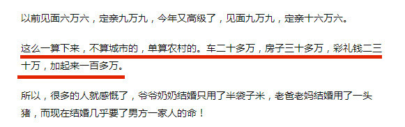 这么一算下来,在个别经济发达的农村地区一场婚礼,车二十多万,房子三十多万,彩礼钱二三十万,加起来甚至都有可能会超过百万。