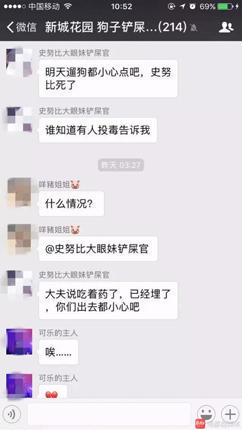 最先发生意外的是一条名为“史努比”的狗狗。12月27日凌晨两点多,这条6个月大的“贵宾狗”突发抽搐、呕吐等症状。一个小时后,它的主人给小区其它住户发消息称,“我的小狗晚上去3楼遛了一圈之后,就产生了疑似中毒的症状。帮我告诉其他人,别去三楼遛狗。”三楼是大冲新城花园小区的公共活动场所。许多住户经常在这里遛狗。但前面的提醒似乎并未被引起足够的重视。 (来自:深圳晚报)