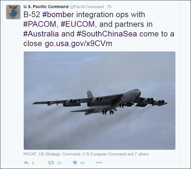 【观察者网综合】据美军太平洋司令部网站消息,美军近日从本土调派了B-52战略轰炸机,与部署在关岛的B-1B轰炸机一起在南海进行了训练,一同参训的还有7架空中加油机和宙斯盾驱逐舰。有分析指出,这是按作战预案进行的演习,美军想要验证大规模地快速部署战略轰炸机。