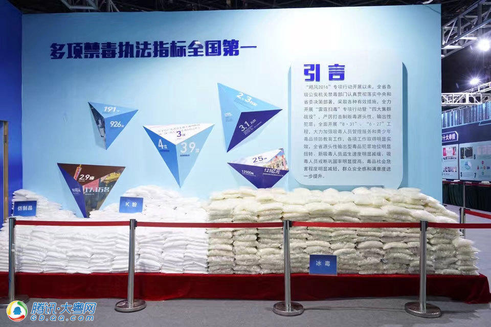 (通讯员:黄康灵 黄桂林)今天(12月30日)上午,广东省公安厅在广州市天河体育中心举行飓风2016成果展示,现场展示了全省公安机关开展打击突出刑事犯罪的特殊案件,展示期从12月30日起至2017年1月8日止,为期10天。市民可在每天上午10点至下午17点现场参观。图为缉毒展区,现场一包包冰毒、K粉堆成了一堵墙。
