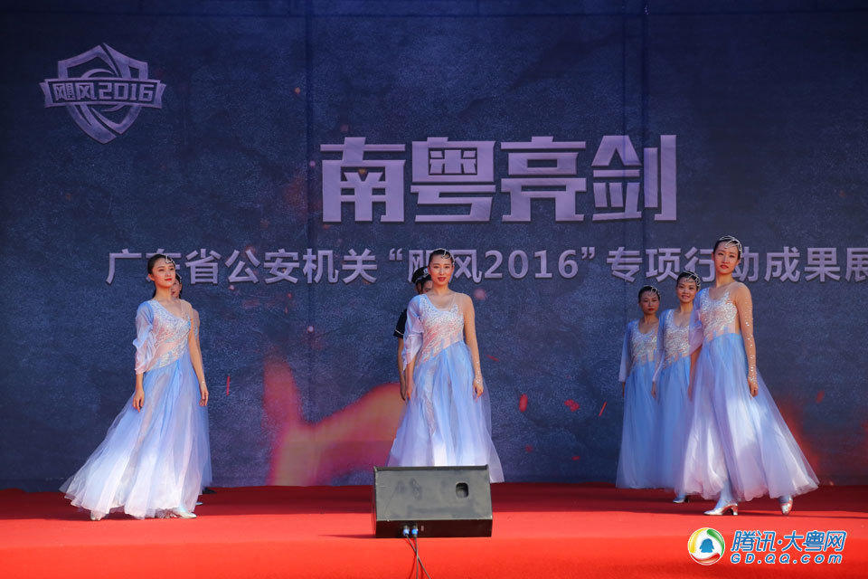 “飓风2016”除了针对几类突出违法犯罪开展重拳打击之外,也强化对重点地区的综合整治。汕尾陆丰、揭阳惠来、广州白云、茂名电白、湛江雷州、深圳宝安、云浮罗定、江门恩平、清远英德等9个地区因盗、抢、骗、毒等地缘性、输出性犯罪频发被列为重点地区,整治任务重。图为文艺表演。