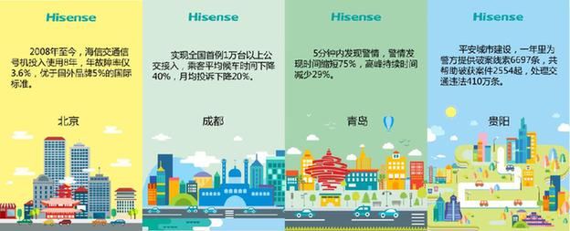 在家庭领域,海信目前拥有全球用户最多的互联网电视平台,2100万互联网电视激活用户数,覆盖超过6000万人群;在数据传输上,海信的宽带接入网光模块连续五年全球市场第一;在城市交通、公共安全等领域,海信拥有15年以上的城市管理和相关服务经验,2012到2015年,国内亿元以上的智能交通大项目海信的中标额占比42%,在公共安全领域与贵阳合作,10000多个摄像头组成的高清视频监控系统成为全国规模最大、功能最先进的高清视频监控系统,一年里为警方提供破案线索6697条,共帮助破获案件2554起,处理交通违法410万条。