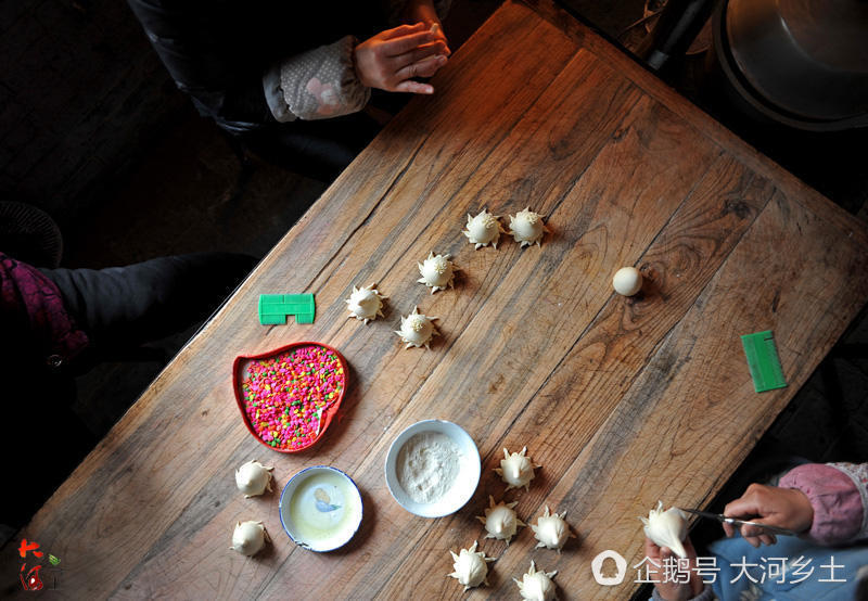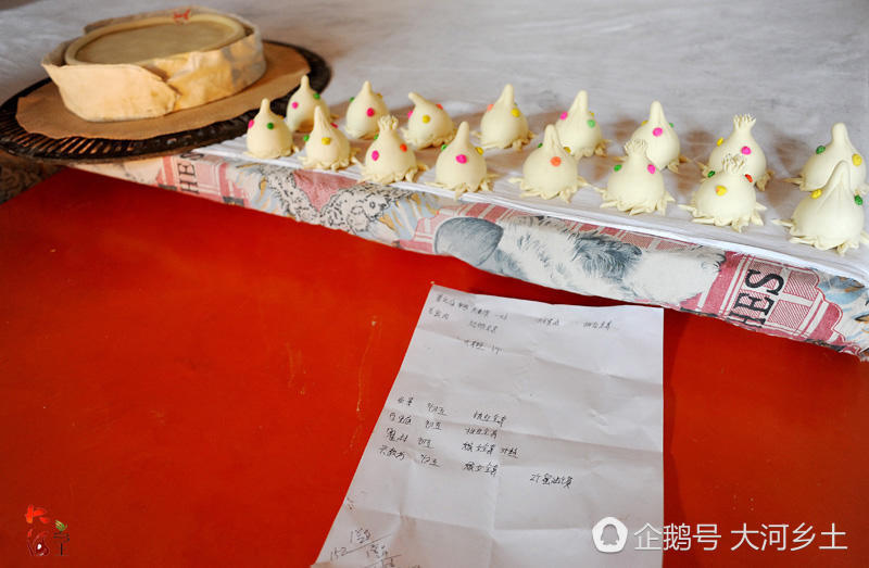 这是一套嫁女花馍在插花前后的拼图,上图为插花前,下图为插花后。这套花馍共有8个大花馍、8个小花馍、3个“子望”馍和3个枣糕馍,被放置在专用的三层食箩里。其中“子望”是长辈给小辈蒸的一种花馍,包有核桃红枣,馍上镶一颗画着人形的熟鸡蛋,取年老时指望孩子照顾的意思。如要了解更多乡村信息,请关注微信公众号“大河乡土”(dahexiangtu),让我们共同体味故土乡愁。