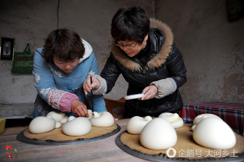 王贞草的儿媳妇和徒弟正在为制作好的花馍涂抹鸡蛋清。鸡蛋清是为了防止一些花馍造型在蒸时沾到一起。