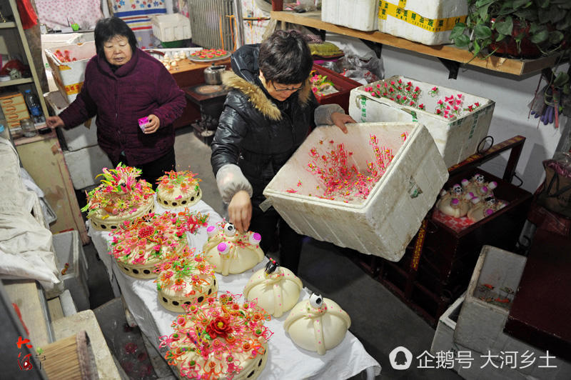 作为山西粮仓的晋南,各县都有各自特色的花馍,目前比较出名的是列入国家级非遗的闻喜花馍,但芮城、临猗等县的花馍也非常有特色。花馍不但能吃,插上色彩鲜艳、造型千姿百态的面花后,还具有极强的观赏性。2016年12月末和2017年元旦期间,摄影师采访了山西临猗里寺村的花馍老艺人王贞草,记录了老人及其家人制作花馍的过程。图为2017年1月2日,王贞草老人制作的嫁女花馍系列。