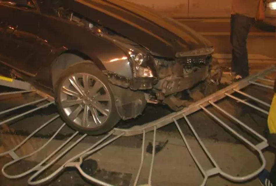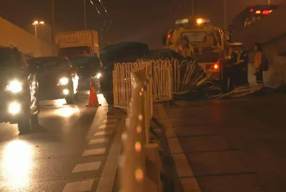眼前这部小车,就好像一个衣衫不整的醉猫一样,任性地躺在马路中间。左侧车头被撞得支离破碎,车胎已经不知道飞到哪儿去了,车内零件散落一地,画面触目惊心!事发在1月6日晚九点半左右,在广州流花路路口转德坭立交的上桥位,一部黑色小车突然失控,撞烂护栏,令行经的几部车都被波及。 (来自:广东广播电视台今日最新闻)