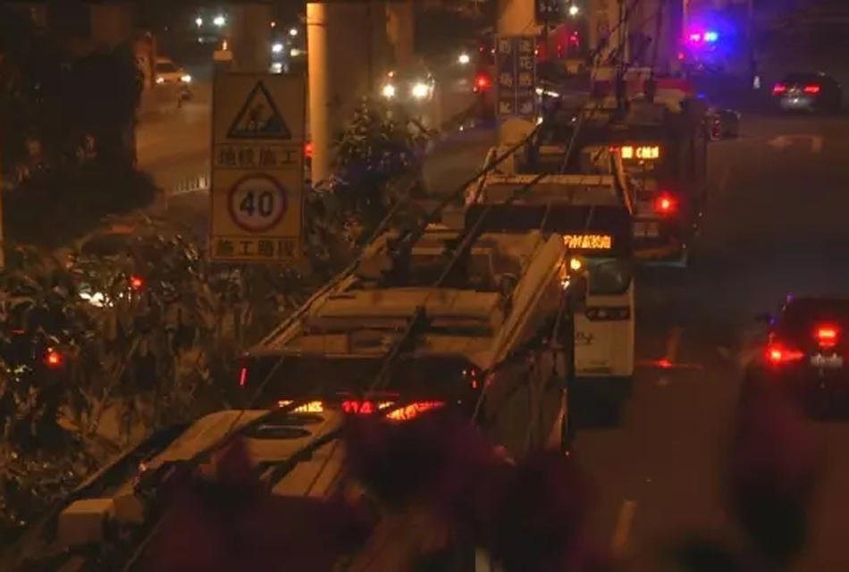 事发后,交警对上桥路段进行封路,造成东风西路一度大塞车。到了夜晚11点半,现场还有将近十部公交车在排长龙。有乘客选择下车步行,都有乘客坚持继续等待。幸亏,到了晚上11点50分左右,事发路段终于解封,在一众喝彩声中,公交司机马上开车出发,让几位乘客可以早点回家。 (来自:广东广播电视台今日最新闻)