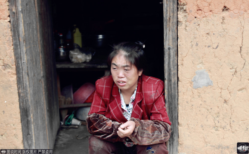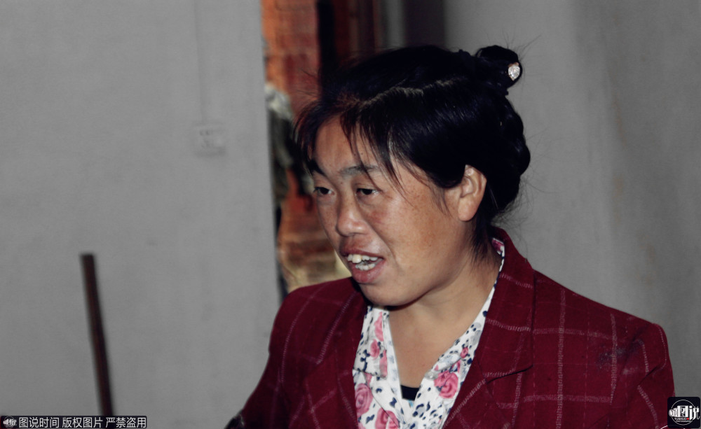 郭秋梅的智力似乎还是停留在五六岁左右,穿着破旧的衣物,一家人的处境状况催人泪下。