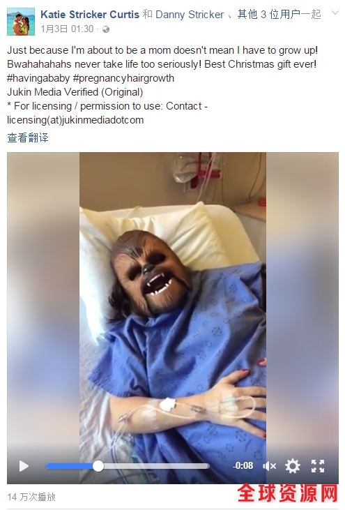 1月3号,Katie在自己的脸书上发了一段12秒的视频,躺在病床上的她双手捂着肚子,脸上戴着这个魔性的楚巴卡面具,她痛苦的呻吟声通过面具翻译成了楚巴卡的声音。
