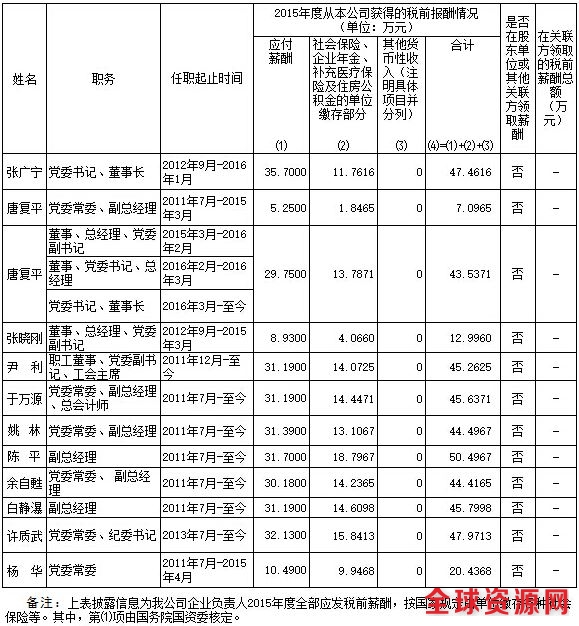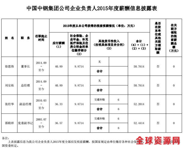 日前,国务院国资委公布了负责管理的111家企业负责人2015年度税前薪酬,这是央企高管薪酬首次全面公开亮相。澎湃新闻(www.thepaper.cn)梳理111家央企中的6家钢铁及相关行业的央企,即:鞍钢集团公司(下称“鞍钢”)、宝钢集团有限公司(下称“宝钢”)、武汉钢铁(集团)公司(下称“武钢”)、中国五矿集团公司(下称“中国五矿”)、中国中钢集团公司(下称“中钢集团”)以及新兴际华集团有限公司(下称“新兴际华”)发现,上述6家央企的负责人2015年度从公司获得的税前报酬基本分布在40万-50万元(除任职不满一整年的)。