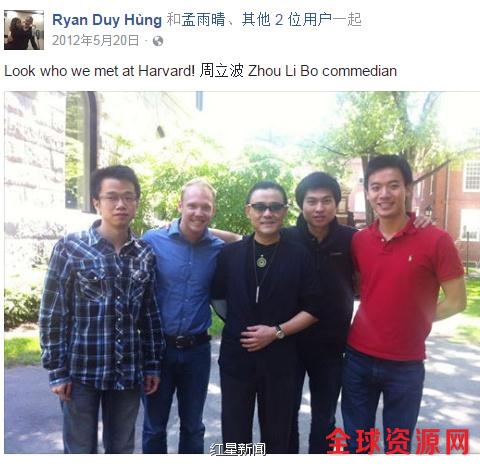 2012年5月20日,唐爽在脸谱网上贴出一张他和周立波等人的合照,并写“Look who we met at Harvard!周立波Zhou Li Bo commedian”。