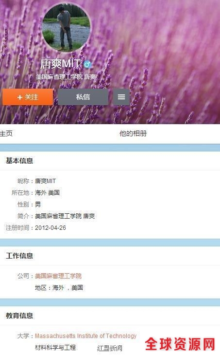 翻看他的微博,成都商报客户端记者发现,唐爽于2012年4月26日发表了第一条微博,而微博的内容,就是转发自己登上麻省理工学院(MIT)网站封面人物的文章。