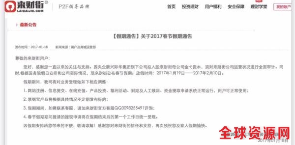 当日,来财街官网首先发布了春节放假通告,称因央企新兴际华集团旗下公司拟入股来财街母公司金弋资本,须对来财街公司运营状况进行全面审计,同时,根据国务院假日安排和公司实际情况,现来财街公布春节假期时间:2017年1月19日-2017年2月10日。这个假期已经达到了23天,远远多于国家法定假日要求的时间。