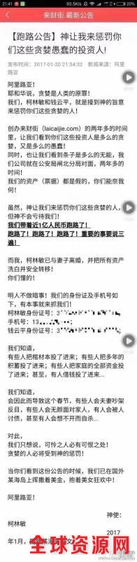 此则署名“神使柯林敏”的公告言辞激烈,以第一人称的语气“数落”投资此平台的投资人“贪婪”“愚蠢”,承认自己的资产(票据)为假造,称警方无能,公告还以“明人不做暗事”的态度公布了两位涉事人柯林敏、钱云平的身份证号码。