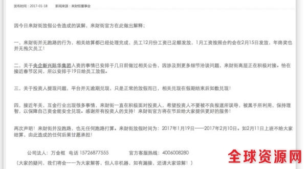声明还表示,央企入股更多细节洽谈问题,来财街高层正在积极对接,恰在接近春节区间,所以安排于19日给员工放假。声明还声称平台并无逾期兑现,假期后会如数兑现。