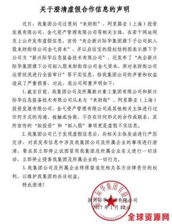 对于这一“抱大腿”的行为,新兴际华1月22日在其官网发布《关于澄清虚假合作信息的声明》,称“央企新兴际华集团旗下公司拟入股金戈资本,须对来财街公司运营状况进行全面审计”为不实信息,并声明新兴际华及其所属新兴重工集团有限公司、新兴际华应急装备技术有限公司从未与来财街、阿里路亚(上海)投资发展有限公司、金戈资产管理有限公司进行过任何方式的沟通、接触或协商,不存在任何形式的合作或联系。