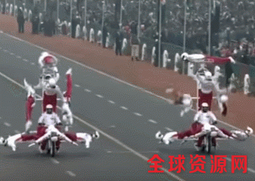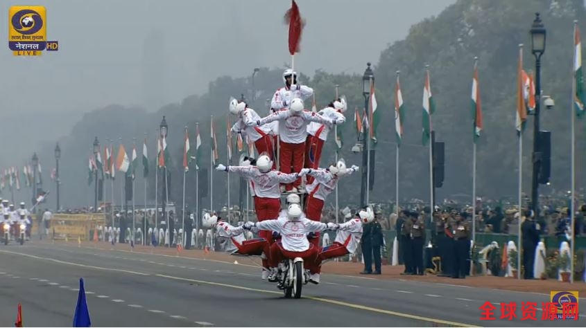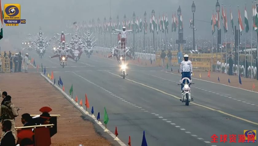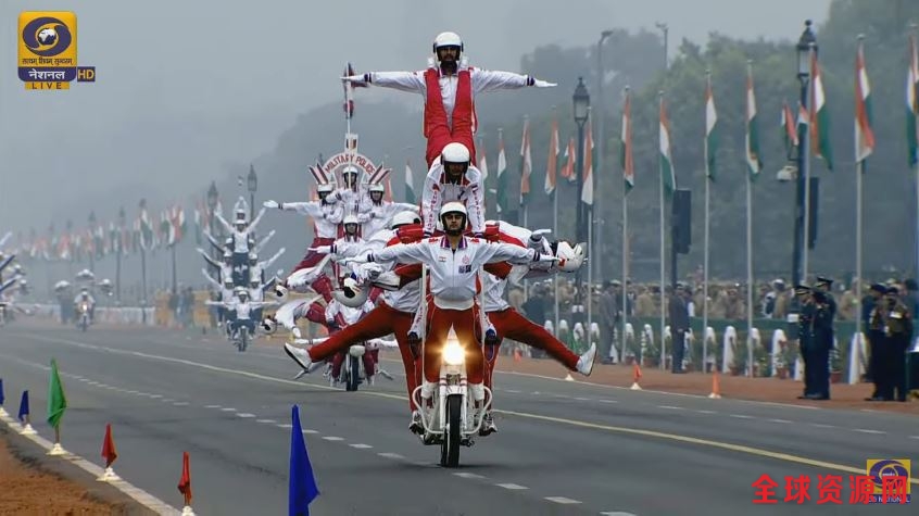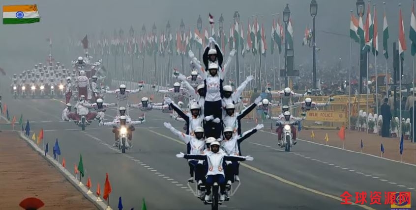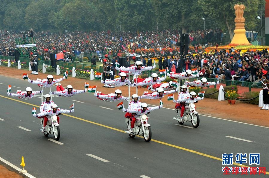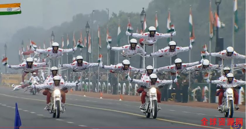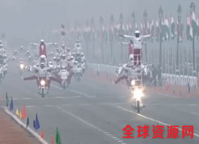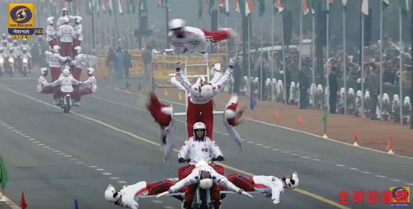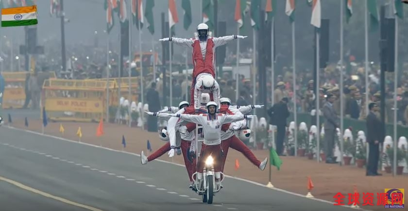 《印度斯坦时报》称,印度阅兵式上每年的“重头戏”都是特具特色的摩托车特技表演,今年也不例外。这支摩托车特技表演队名为“Shwet Ashwas”,来自印度宪兵部队。在1995年,133名队员在11辆摩托车叠罗汉并行驶了350米,创下了吉尼斯世界纪录。