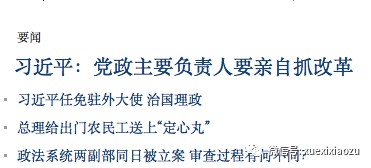 往年,习总也对党政主要负责人提要求,但今年异常明确,相关要求首次上到新华社通稿的主标题中(新华社通稿主标题:党政主要负责同志要亲力亲为抓改革扑下身子抓落实),不同寻常。
