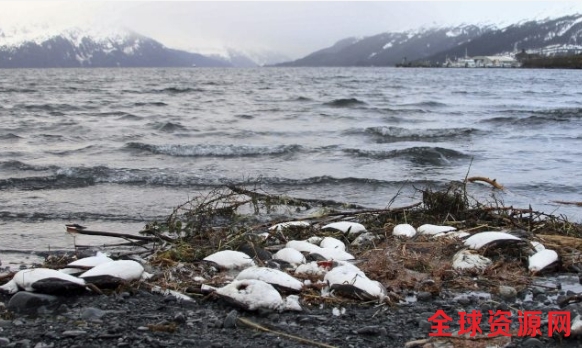 加州至阿拉斯加州北太平洋沿岸發現數萬隻海鳥屍體,研究人員稱,海水溫度升高,影響小魚生存,以小魚為食的海鴉因此餓死或擱淺。