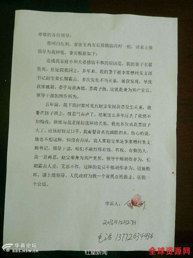 尊敬的各位领导,我叫白红利,家住宝鸡市石鼓镇庙沟村一组,请求上级领导为我伸冤,事实根据如下: