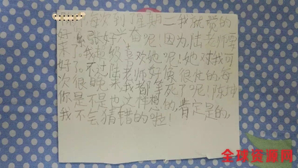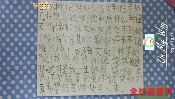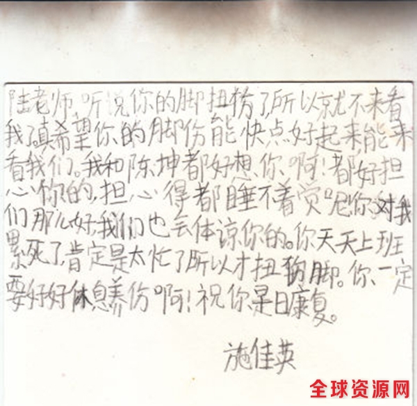 另一封信写道:“陆老师,听说你的脚扭伤了,所以就不来看我们了,真希望你的脚上能快点好起来,能来看我们!我和陈坤都好想你啊!都好担心你的,担心得都睡不着觉呢!……”