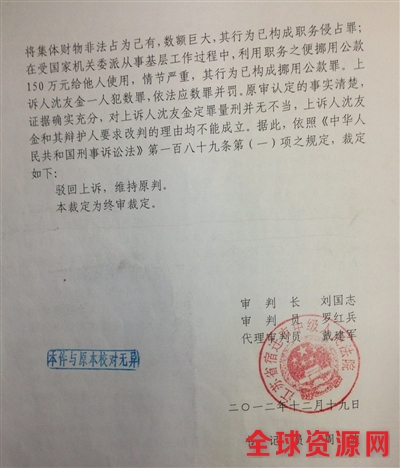 沈友金一案的二审判决书。