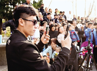 舞台中央,除了已经在莲花池成名的舞者,不断有新的面孔抢到镜头中来。他们或舞出自己的特色舞姿,或热情介绍自己的粉丝量。一名中年妇女更是引吭高歌,先是用鸡鸣亮嗓,随后又模仿起母鸡下蛋的动作,听到掌声响起才满意地起身变换新的动作。