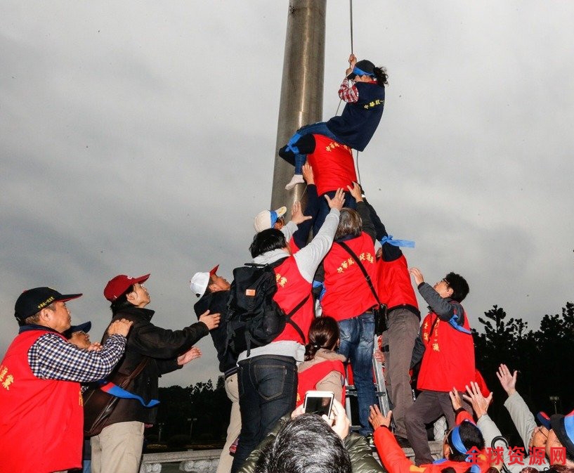 岛内的中国统一促进党支持者,将中正纪念堂前广场上的“半旗”升起。馆方派人将旗再次降下,统一党支持者再次拿梯子爬上去将旗升上。(图片来源:台湾联合新闻网)