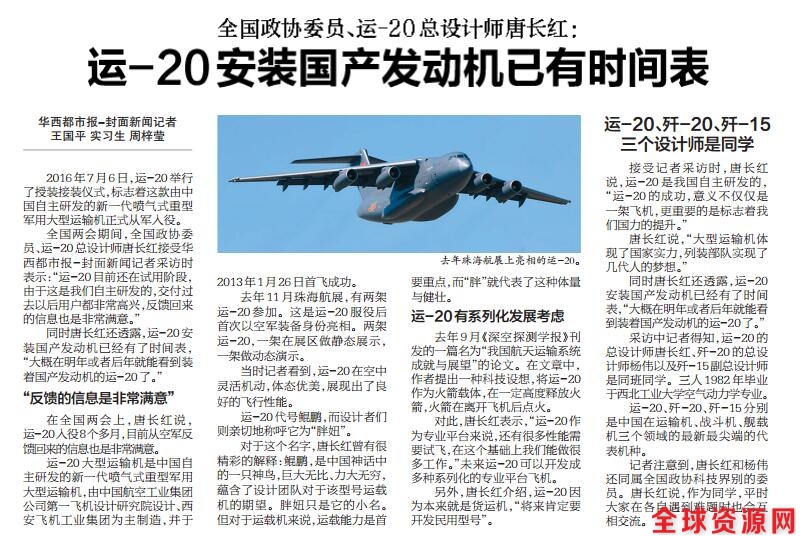 【环球网军事3月10日报道】全国两会期间,全国政协委员、运-20总设计师唐长红接受采访时表示:运-20目前还在试用阶段,由于自主研发,交付以后用户反馈的信息是“非常满意”;他还透露,运-20安装国产发动机已经有了时间表,“大概在明年或后年就能看到装着国产发动机的运-20了。”