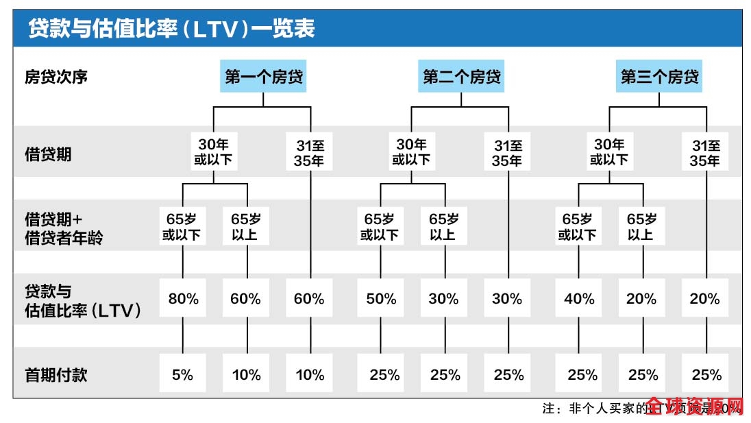 譬如,借贷者申请房贷的次序,就会限制LTV。若借贷期不超过30年,第一所房子的房贷LTV,可达80%。第二和第三个房贷的LTV顶限,则分别是50%和40%。若借贷期超过30年或借贷者要过了65岁才能还清房贷,第一个房贷的顶限则是60%,第二和第三个房贷的顶限则分别是30%和20%。