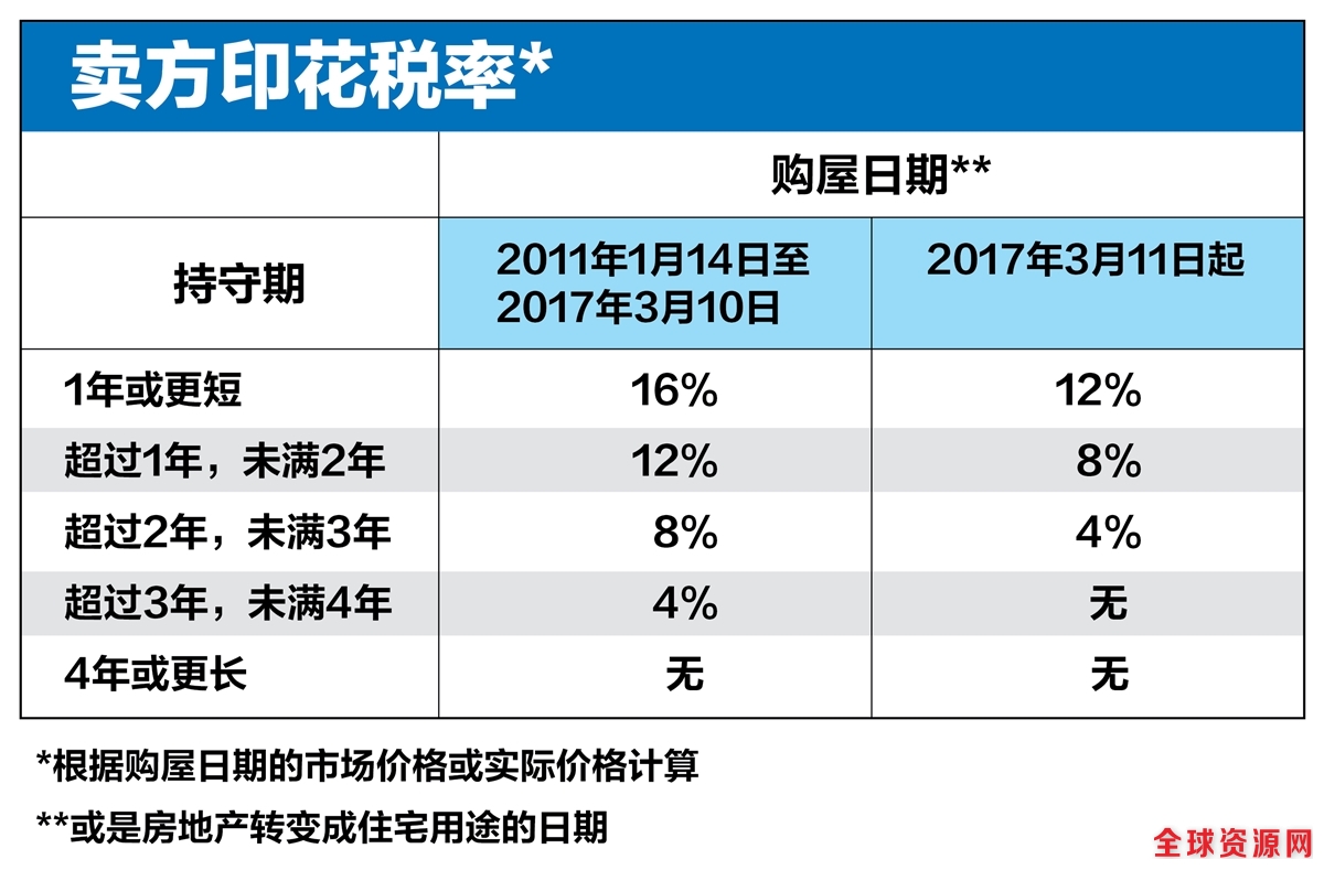 目前,屋主若在购买私人房地产后的四年内卖出房子,须支付相当于房价4%至16%的卖方印花税,卖出的时间越早,税率就越高。