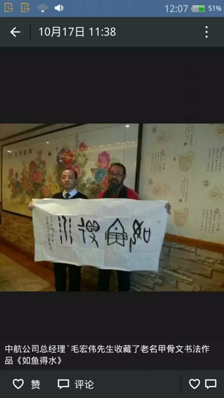 先生书画印俱佳,尤精篆刻,更擅甲骨。其篆其字,脉承商殷,直达秦汉,神韵古风,质朴厚重。先生为人敦厚,心性善良,豪爽好客,处事通达。所谓字如其人,画似风骨,一字一画,一刀一迹,端庄古朴,深蕴禅意。所谓德隆艺盛,道义相擎。人言:“家中挂字画,主人必富贵。”吾言之:“家中挂老名字画,主人必大富大贵。”