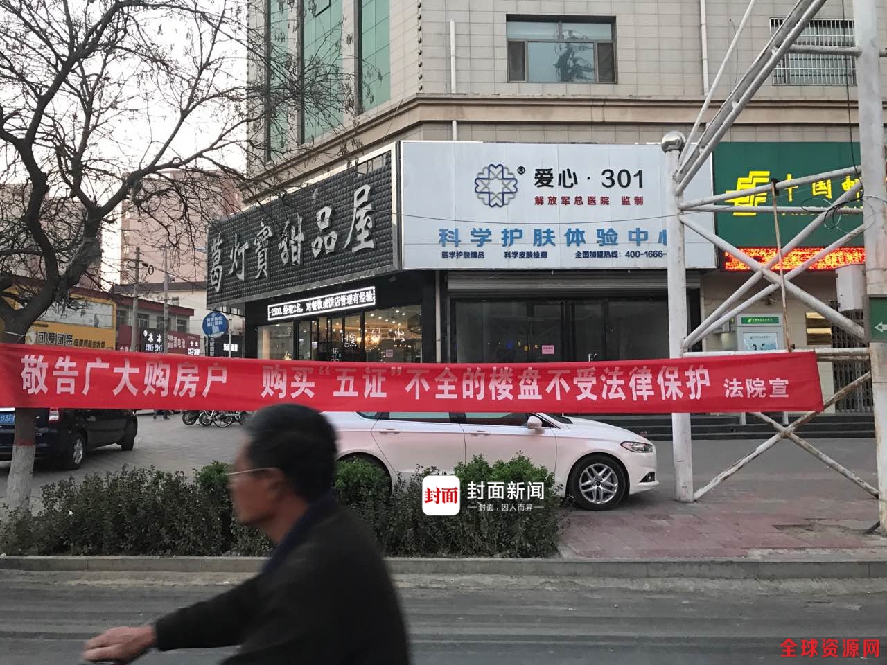 此外,记者还了解到,安新当地法院也参与到此轮打击违法房屋建设销售的行动中。在该县政府驻地附近的一条街道上,记者注意到一条红色横幅,落款为“法院宣”。横幅写着“敬告广大购房户购买’五证’不全的楼盘不受法律保护”。