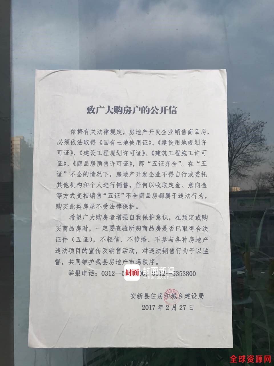 安新县住房和城乡建设局《致广大购房户的公开信》。